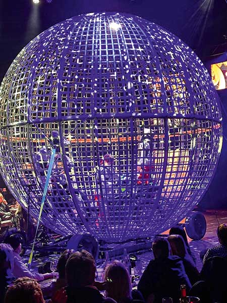 Und abgeschlossen wird die Show mit Bikern, die in einer Stahlkugel in wahnwitzigem Tempo unter- und übereinander rotieren. Ein furioses Spektakel der Sonderklasse. Dazwischen gibt’s es Hand-auf-Hand-Akrobatik, Rollschuhrassanz, einen fliegenden Artisten auf dem russischen Barren und mehr auf artistisch höchsten Niveau.