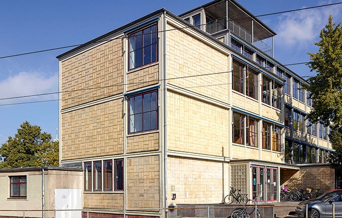Der östliche, dominierende fünfgeschossige Flügel enthält die Verwaltung im Erdgeschoss, darüber die Klassenräume der Oberstufe und die Fachklassen. Außergewöhnlich ist der zweiseitig belichtete Zeichensaal im obersten Geschoss. Im Souterrain ist ein Musiksaal eingerichtet. Die sichtbare Stahlbeton-Rahmenkonstruktion gliedert den Bau allseitig. Geschlossene mit gelben Keramikplatten verkleidete Brüstungsfelder wechseln sich mit der großzügigen Befensterung ab, die dem Gebäude eine starke Offenheit und Transparenz verleihen. Taut verwirklicht damit in seinem Schulbau das Prinzip von „Licht, Luft und Sonne“, einem Grundsatz der Reformarchitektur vom Beginn des 20. Jahrhunderts.