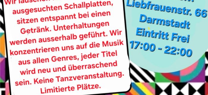 Wir lauschen entspannt und relaxt für 3 Nachmitttage ausgesuchten Schallplatten, sitzen entspannt bei einen Getränk zusammen. Unterhaltungen werden ausserhalb geführt. Wir konzentrieren uns auf die Musik aus allen Generes in angenehmer Zimmerlautstärke, jeder Titel wird neu und überraschend sein.
