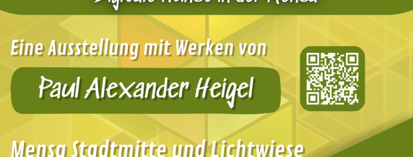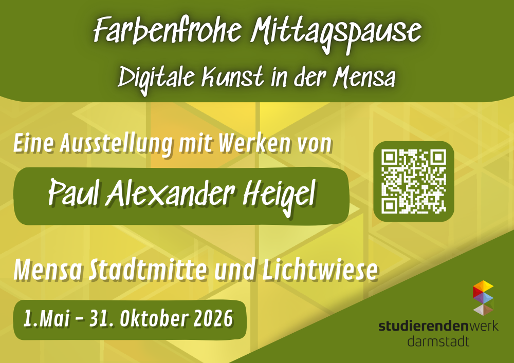 In einer Ausstellung in der Mensa Stadtmitte und Lichtwiese sind über sechs Monate ca. 80 digital gestaltete Bilder des Darmstädter Digitalkünstlers Paul Alexander Heigel zu sehen. Die Motive sind dabei sehr vielfältig: Von Pflanzen und Tieren, über Gruselige Figuren bis hin zu abstrakten digitalen Formationen und Stimmungsbildern. Insgesamt findet sich etwas aus all seinen Schaffensperioden.