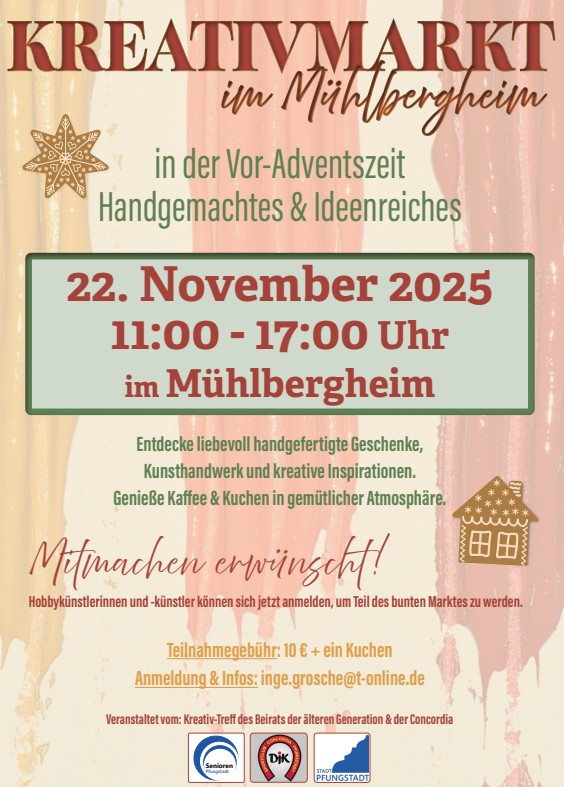Die Kreativ-Frauen des gemeinsamen Kreativ-Treffs von Beirat der älteren Generation und der Concordia konnten alle verfügbaren Tische an die Hobbykünstlerinnen und -künstler vergeben, so dass ein vielfältiges Angebot von Handgemachtem & Ideenreichem bei diesem Markt vorhanden ist. Für das leibliche Wohl sorgen die Kreativ-Frauen. Infos oder Rückfragen sind über info@senioren-pfungstadt.de erhältlich.