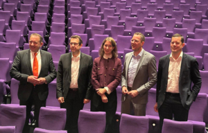 An der Pressekonferenz nahmen der Hessische Finanzminister Prof. Dr. Alexander Lorz, Darmstadt Oberbürgermeister Hanno Benz, Projektmanagerin Susanne Ritter (Landesbetrieb Bau und Immobilien Hessen), Staatssekretär Christoph Degen aus dem Hessischen Kunst-, und Kulturministerium und der Intendant des Staatstheaters, Karsten Wiegand teil (v.l.n.r.).
